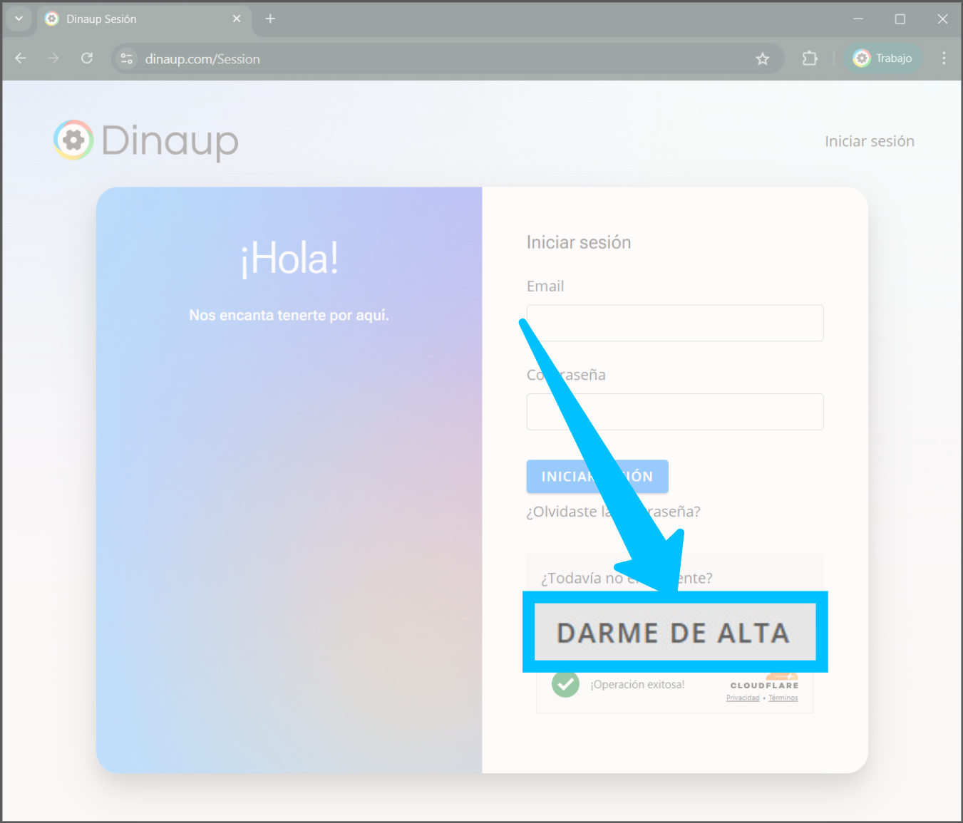Visita [dinaup.com](https://dinaup.com) y pulsa en **Iniciar sesión**. En la parte inferior del formulario verás un enlace que dice **“`Darme de alta`”**. Haz clic ahí para comenzar el registro.