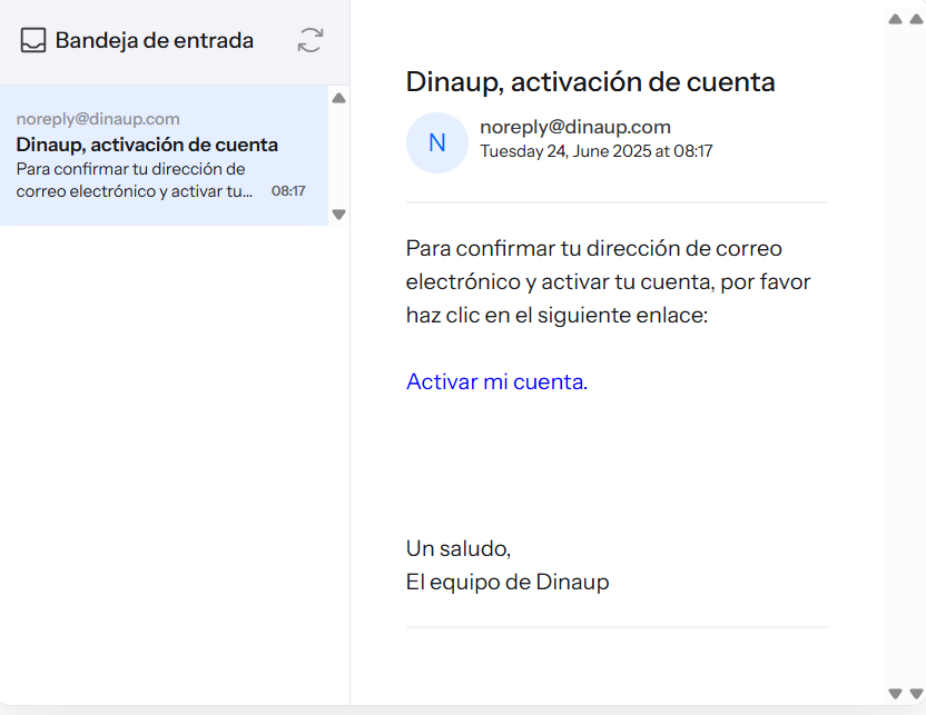 Revisa tu bandeja de entrada. Recibirás un email con el asunto **"Dinaup, activación de cuenta"**. Haz clic en **“`Activar mi cuenta`”** para confirmar tu correo y validar el acceso.