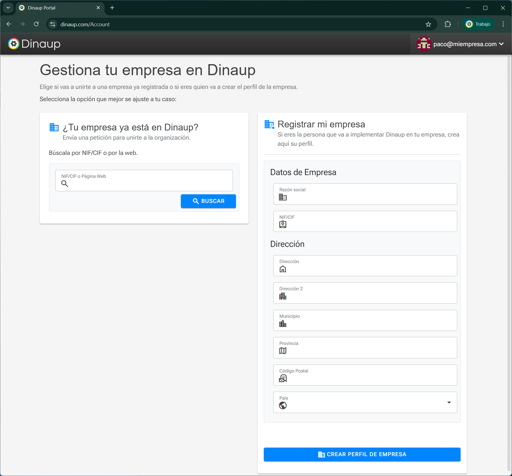 1. En la pantalla principal verás un campo que dice: **¿Tu empresa ya está en Dinaup?**