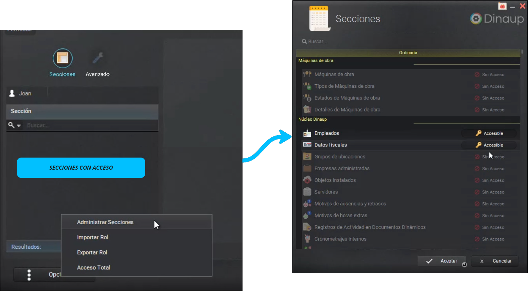 En Dinaup, los menús también se adaptan al rol de cada usuario para que cada uno vea solo lo que necesita.