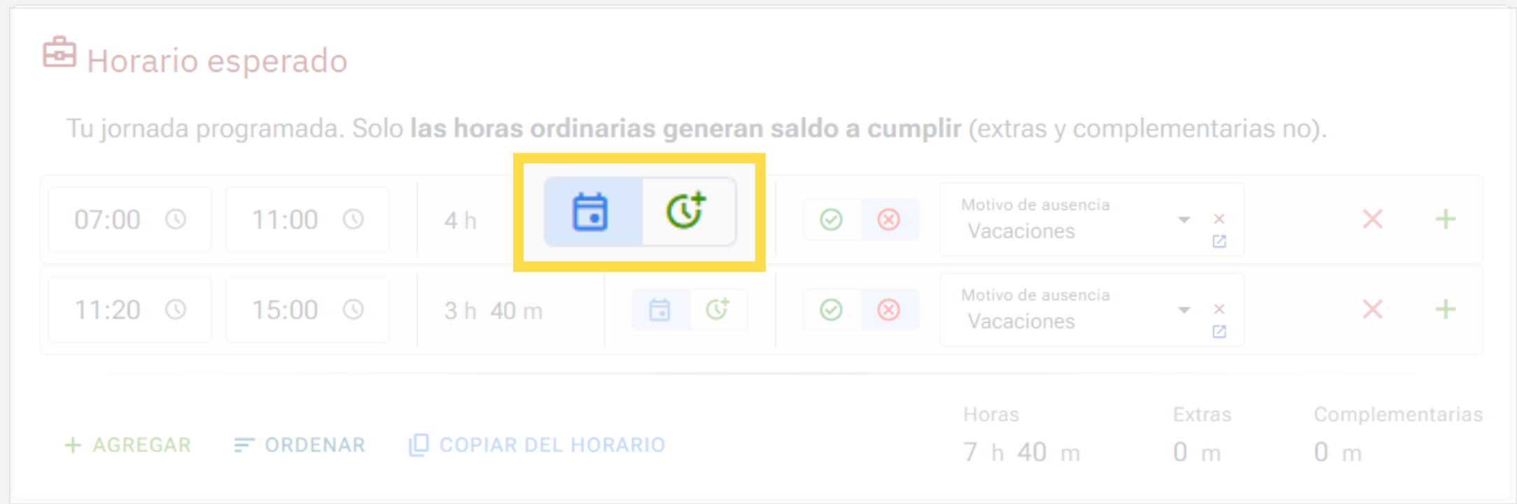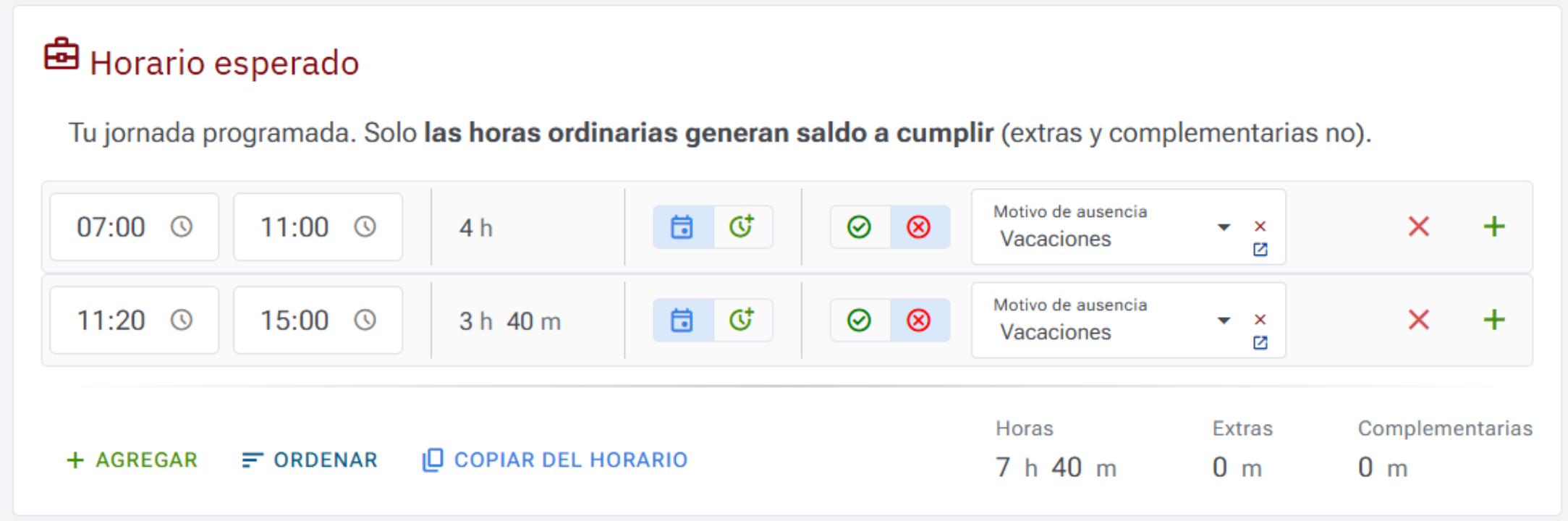 Las horas esperadas se crean cada día según el horario asignado al usuario. Si deseas planificar un día futuro, puedes abrir el editor de fichaje y pulsar sobre `Copiar del horario`.